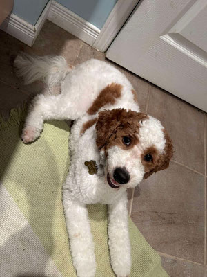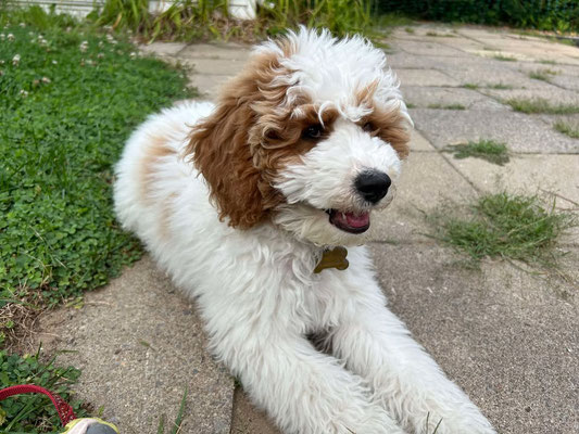 Mamzelle est une Goldendoodle F1BB de 20.5 lbs. Brillante et coquine, elle est très enthousiaste quand vient le temps de rencontrer de nouveaux humains.