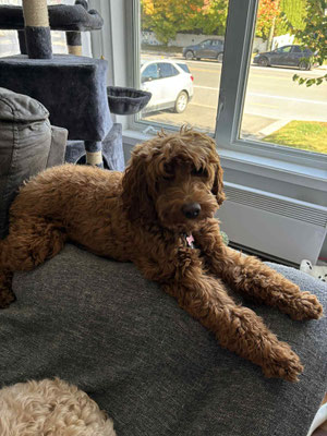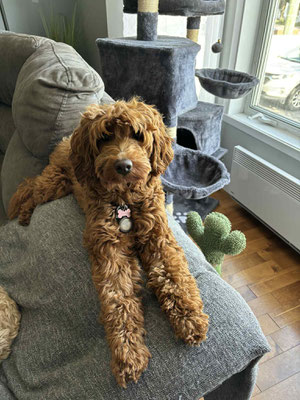 Yoko est une magnifique Goldendoodle Tiny (Mini) de 20 lbs , est douce dans tous les sens du terme. Yoko est calme et toujours prête à se laisser câliner. Elle s’entend super bien avec les autres animaux de la maison. Parfois un peu timide la première fois qu’elle voit les gens ou lorsqu'il y a beaucoup de monde dans la maison mais lorsqu'elle se « dégêne » c’est une vraie petite boule d’amour.